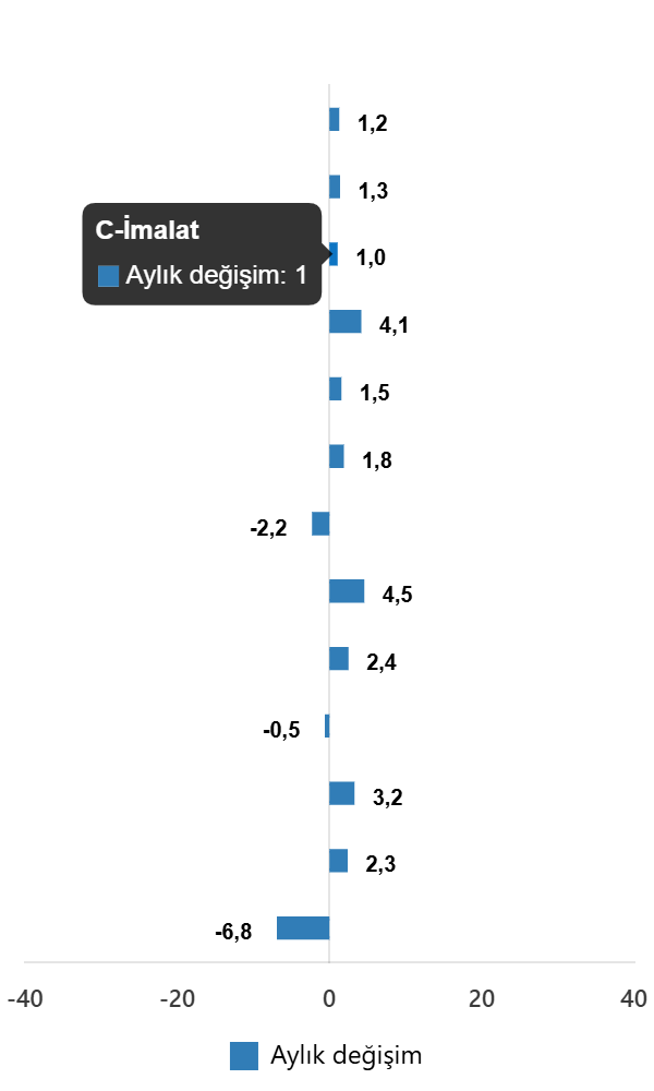 Sanayinin alt sektörleri incelendiğinde, 2025 yılı Aralık ayında madencilik ve taş ocakçılığı sektörü endeksi bir önceki aya göre %1,3 arttı, imalat sanayi sektörü endeksi %1,0 arttı ve elektrik, gaz, buhar ve iklimlendirme üretimi ve dağıtımı sektörü endeksi %4,1 arttı.