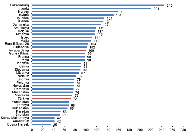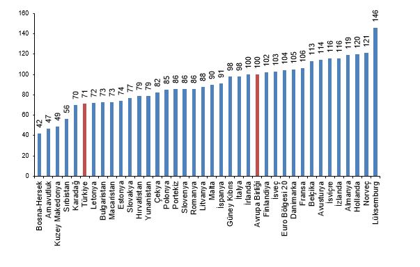 Kişi başına fiili bireysel tüketim düzeyi 27 Avrupa Birliği ülkesi ortalaması 100 iken, Türkiye için 71 oldu ve AB ortalamasının %29 altında kaldı. Karşılaştırmalarda yer alan 36 ülke arasında kişi başına fiili bireysel tüketim değeri en yüksek ülke 146 ile Lüksemburg, en düşük ülke ise 42 ile Bosna-Hersek oldu.