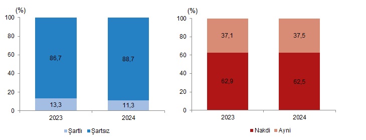Şartlı yardımlar içinde en büyük payı %51,2 ile aile/çocuk yardımları oluşturdu. Bunu %19,3 ile engelli/malul yardımları ve %12,3 ile hastalık/sağlık bakımı yardımları takip etti.