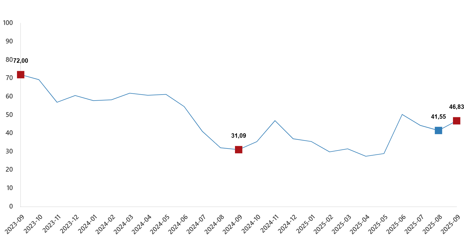 Tarım-ÜFE’de (2020=100), 2025 yılı Eylül ayında bir önceki aya göre %5,80 artış, bir önceki yılın Aralık ayına göre %28,90 artış, bir önceki yılın aynı ayına göre %46,83 artış ve on iki aylık ortalamalara göre %37,98 artış gerçekleşti.