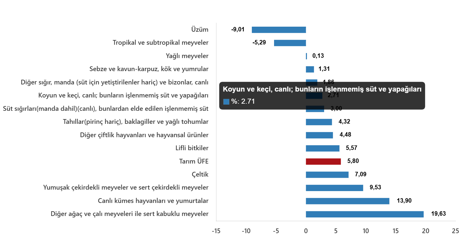 Sektörlerde bir önceki aya göre, tarım ve avcılık ürünleri ve ilgili hizmetlerde %6,28 artış, ormancılık ürünleri ve ilgili hizmetlerde %0,25 artış ve balık ve diğer balıkçılık ürünleri; su ürünleri; balıkçılık için destekleyici hizmetlerde %1,96 azalış gerçekleşti. Ana gruplarda bir önceki aya göre, tek yıllık (uzun ömürlü olmayan) bitkisel ürünlerde %5,10 artış, çok yıllık (uzun ömürlü) bitkisel ürünlerde %4,38 artış ve canlı hayvanlar ve hayvansal ürünlerde %3,42 artış gerçekleşti.