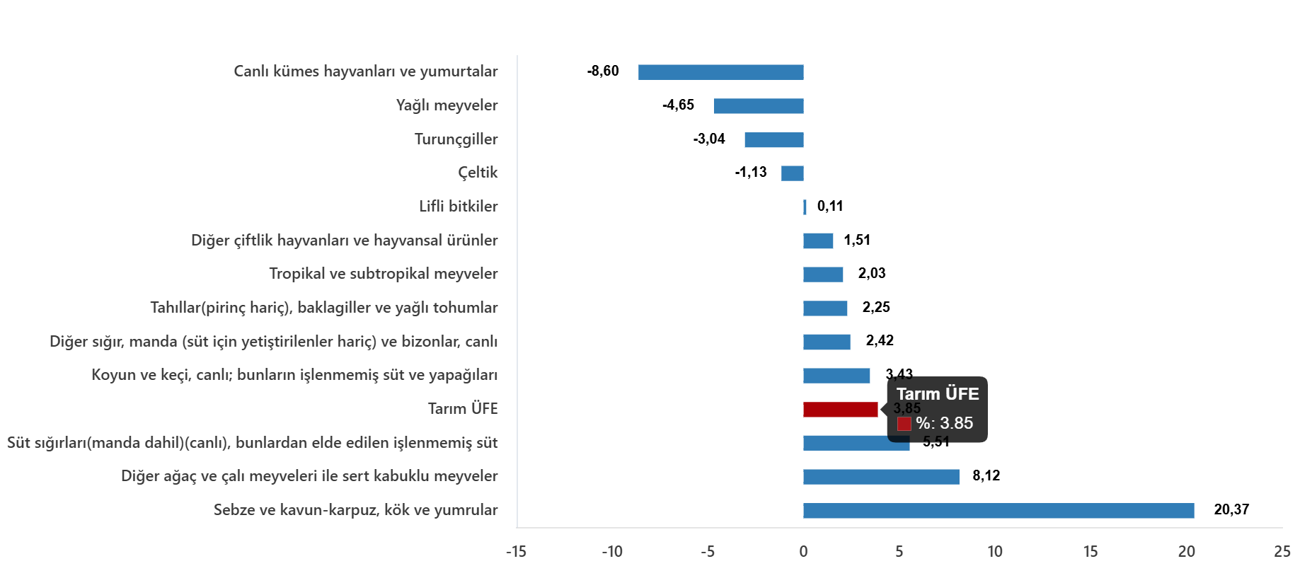Sektörlerde bir önceki aya göre, tarım ve avcılık ürünleri ve ilgili hizmetlerde %4,06 artış, ormancılık ürünleri ve ilgili hizmetlerde %1,79 artış ve balık ve diğer balıkçılık ürünleri; su ürünleri; balıkçılık için destekleyici hizmetlerde %0,10 azalış gerçekleşti. Ana gruplarda bir önceki aya göre, tek yıllık (uzun ömürlü olmayan) bitkisel ürünlerde %12,21 artış, çok yıllık (uzun ömürlü) bitkisel ürünlerde %7,34 azalış ve canlı hayvanlar ve hayvansal ürünlerde %3,30 artış gerçekleşti.
