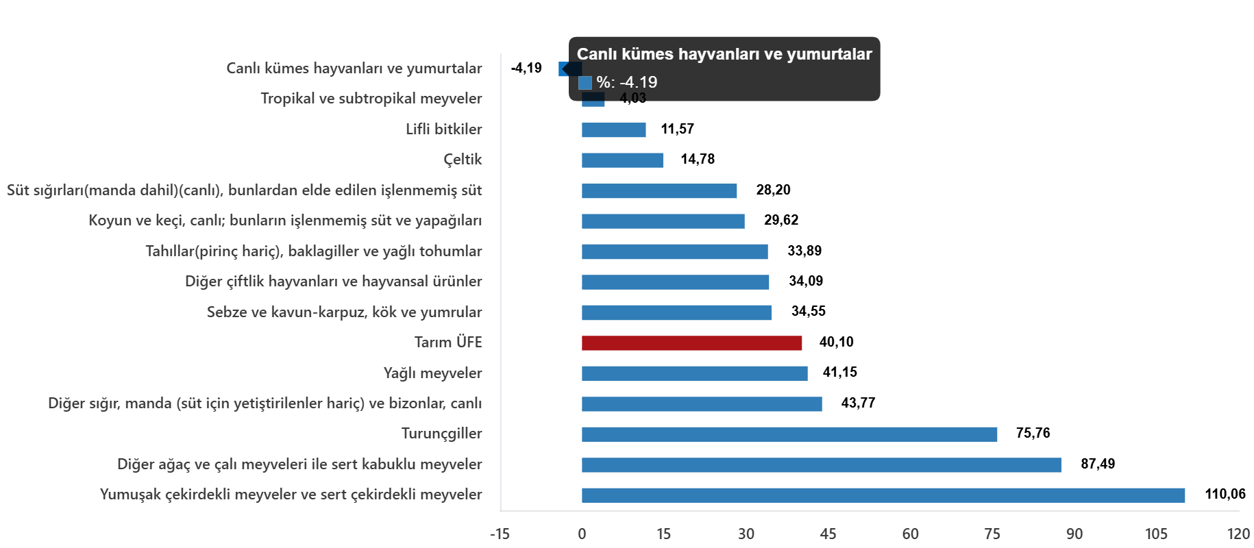 Yıllık değişimin en yüksek olduğu alt grup %110,06 artış ile yumuşak çekirdekli meyveler ve sert çekirdekli meyveler, aylık değişimin en yüksek olduğu alt grup %24,52 artış ile turunçgiller oldu.