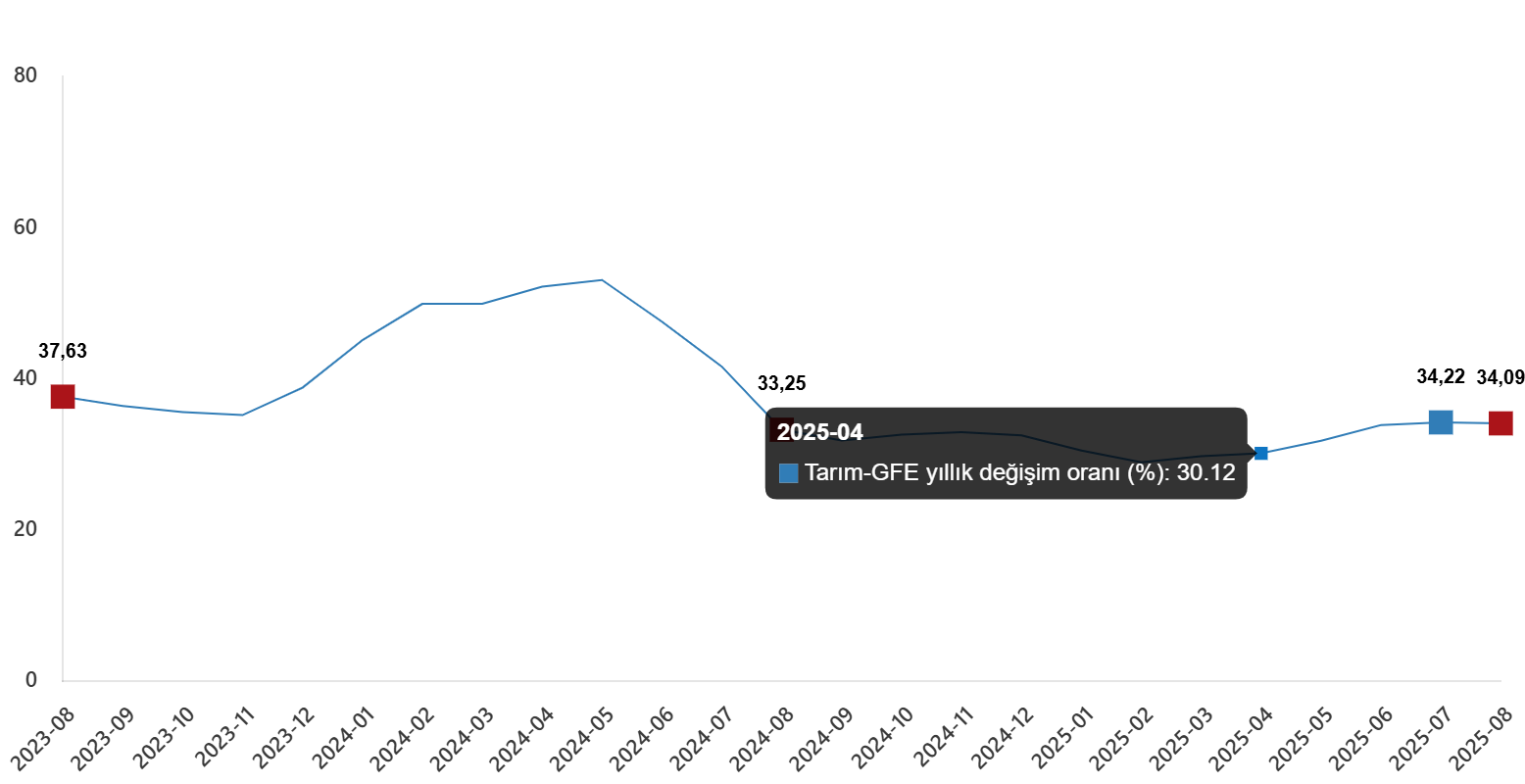 Tarım-GFE’de (2020=100), 2025 yılı Ağustos ayında bir önceki aya göre %1,30 artış, bir önceki yılın Aralık ayına göre %23,81 artış, bir önceki yılın aynı ayına göre %34,09 artış ve on iki aylık ortalamalara göre %31,94 artış gerçekleşti.