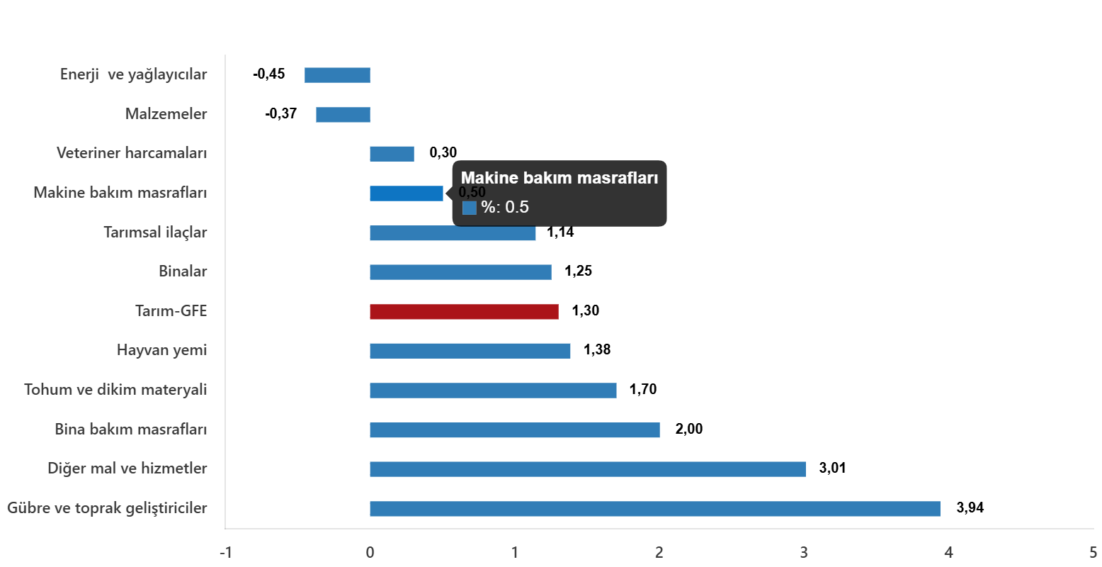 Yıllık değişimin en yüksek olduğu alt grup %59,79 artış ile veteriner harcamaları, aylık değişimin en yüksek olduğu alt grup %3,94 artış ile gübre ve toprak geliştiriciler oldu.