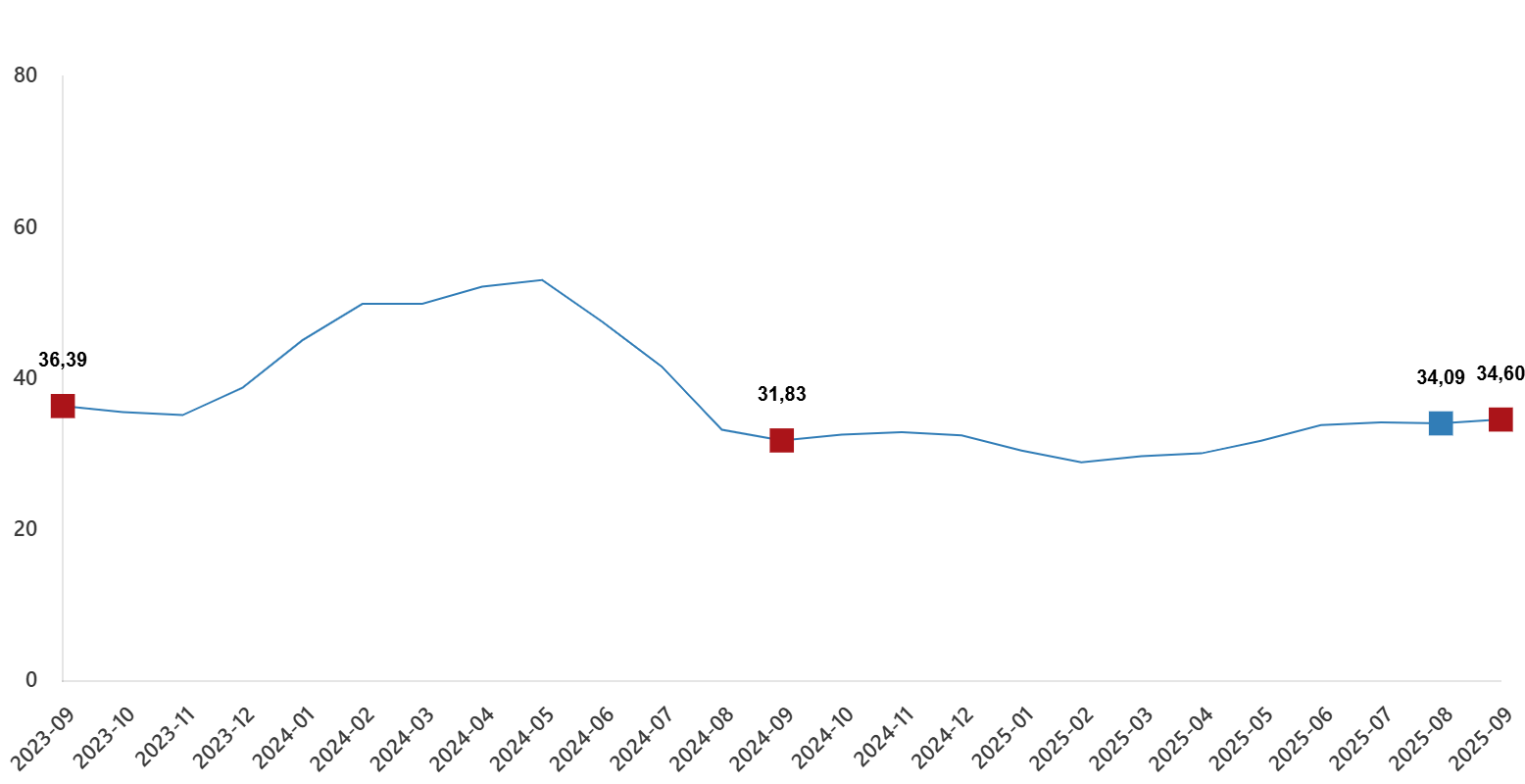 Tarım-GFE’de (2020=100), 2025 yılı Eylül ayında bir önceki aya göre %2,16 artış, bir önceki yılın Aralık ayına göre %26,48 artış, bir önceki yılın aynı ayına göre %34,60 artış ve on iki aylık ortalamalara göre %32,19 artış gerçekleşti.