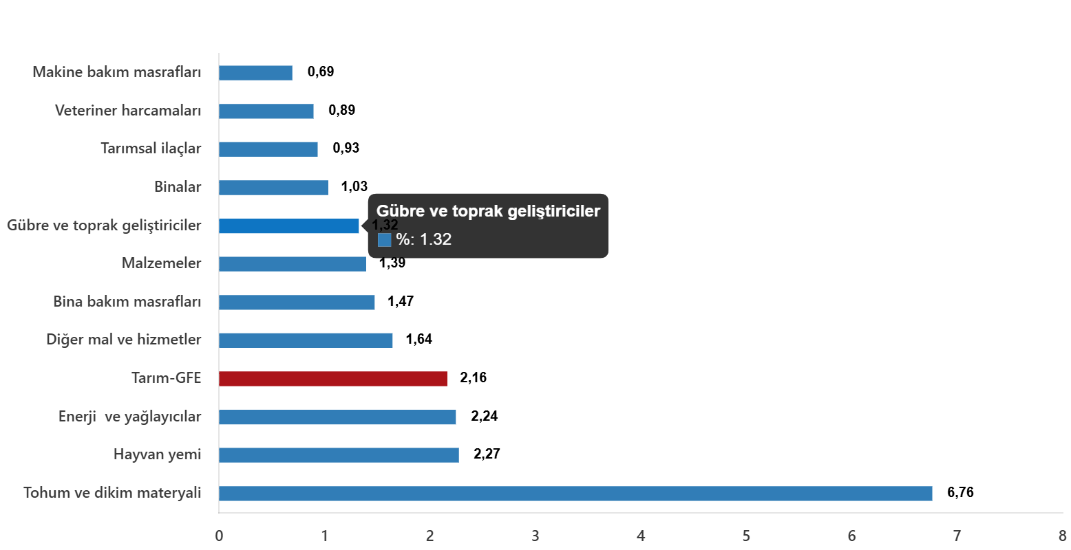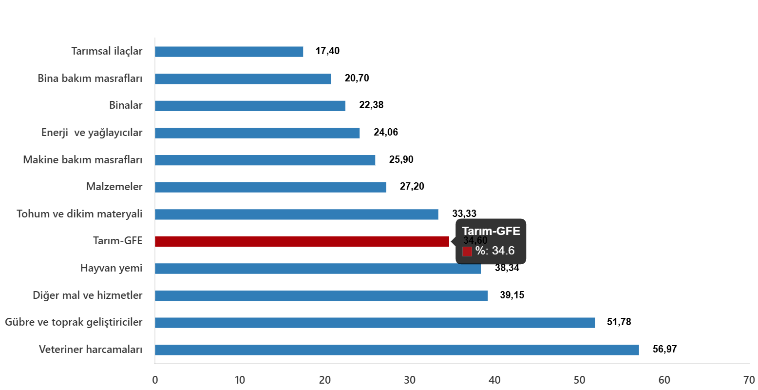 Yıllık değişimin en yüksek olduğu alt grup %56,97 artış ile veteriner harcamaları, aylık değişimin en yüksek olduğu alt grup %6,76 artış ile tohum ve dikim materyali oldu.