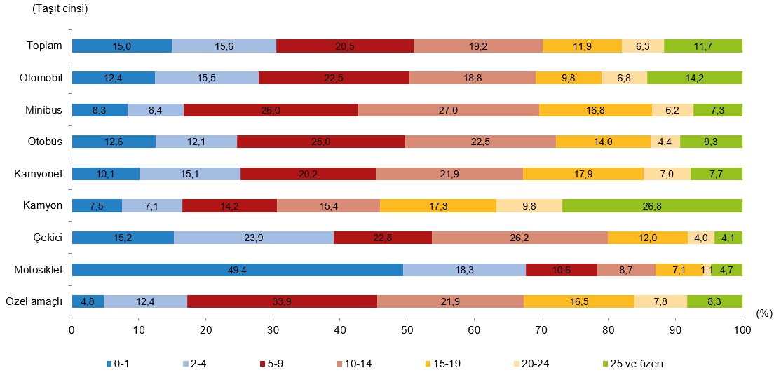 Türkiye’de 2024 yılında katedilen toplam mesafe taşıtların yaş gruplarına göre incelendiğinde; en fazla yol %20,5’lik oranla taşıt filosunun %16,8’ini oluşturan 5-9 yaş grubu taşıtlar tarafından yapılırken, bunu sırasıyla %19,2 ile 10-14 yaş, %15,6 ile 2-4 yaş, %15,0 ile 0-1 yaş, %11,9 ile 15-19 yaş, %11,7 ile 25 yaş ve üzeri ve %6,3 ile 20-24 yaş grubu taşıtlar takip etti. Bu oran otomobillerde 5-9 yaş otomobiller için %22,5, 10-14 yaş için %18,8, 2-4 yaş için %15,5, 25 yaş ve üzeri için %14,2, 0-1 yaş için %12,4, 15-19 yaş için %9,8 ve 20-24 yaş için ise %6,8 oldu.