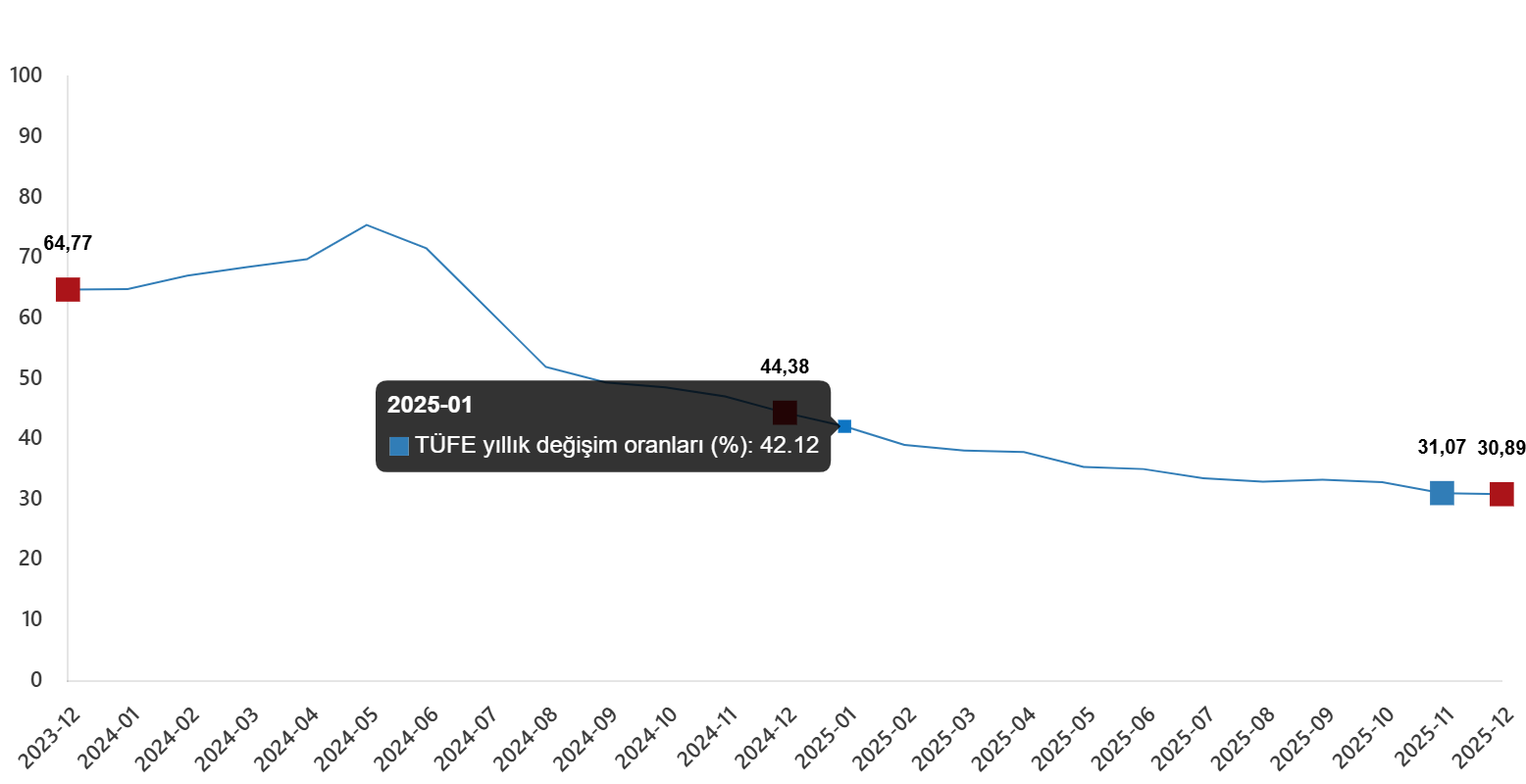 TÜFE’deki (2003=100) değişim 2025 yılı Aralık ayında bir önceki aya göre %0,89 artış, bir önceki yılın Aralık ayına göre %30,89 artış, bir önceki yılın aynı ayına göre %30,89 artış ve on iki aylık ortalamalara göre %34,88 artış olarak gerçekleşti.