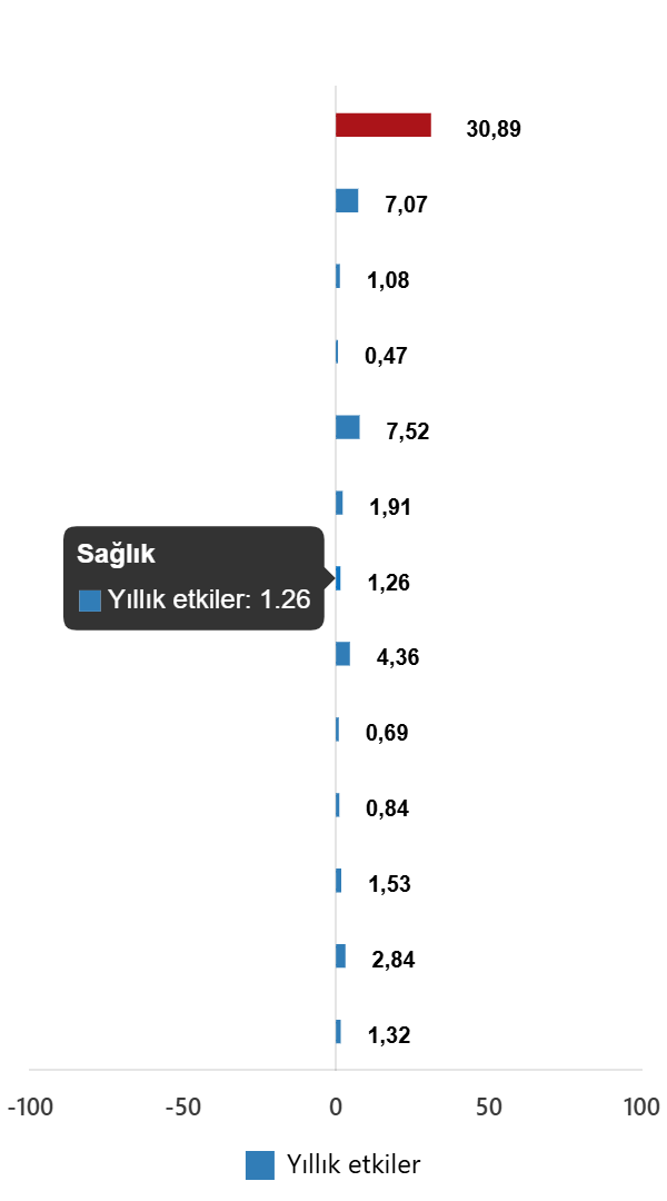En yüksek ağırlığa sahip 3 ana harcama grubunun yıllık değişimleri; gıda ve alkolsüz içeceklerde %28,31 artış, ulaştırmada %28,44 artış ve konutta %49,45 artış olarak gerçekleşti. İlgili ana grupların yıllık değişime olan etkileri ise gıda ve alkolsüz içeceklerde %7,07, ulaştırmada %4,36 ve konutta %7,52 oldu.