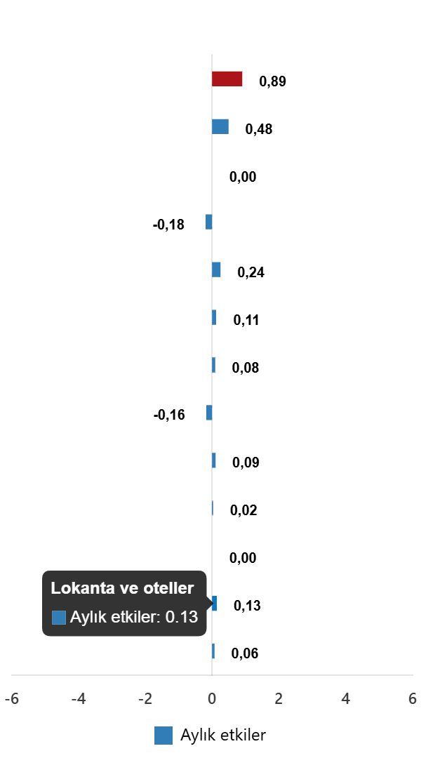 En yüksek ağırlığa sahip 3 ana harcama grubunun aylık değişimleri; gıda ve alkolsüz içeceklerde %1,99 artış, ulaştırmada %1,03 azalış ve konutta %1,39 artış olarak gerçekleşti. İlgili ana grupların aylık değişime olan etkileri ise gıda ve alkolsüz içeceklerde %0,48, ulaştırmada %-0,16 ve konutta %0,24 oldu. (ana harcama gruplarına göre endeksler, ağırlıklar ve değişim oranları Ek Tablo-1’de, ana harcama gruplarının genel endeksteki aylık ve yıllık değişime olan etkileri Ek Tablo-5’tedir).