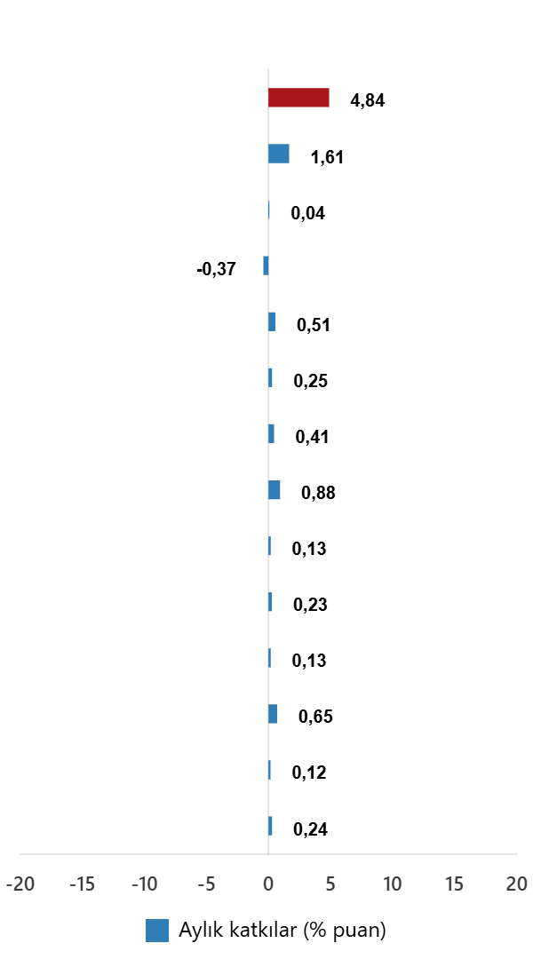 En yüksek ağırlığa sahip üç ana harcama grubunun yıllık değişimleri; gıda ve alkolsüz içeceklerde %31,69 artış, ulaştırmada %29,39 artış ve konut, su, elektrik, gaz ve diğer yakıtlarda %45,36 artış olarak gerçekleşti. İlgili ana harcama gruplarının yıllık değişime olan katkıları ise gıda ve alkolsüz içeceklerde 7,82, ulaştırmada 4,64 ve konut, su, elektrik, gaz ve diğer yakıtlarda 6,74 yüzde puan oldu.