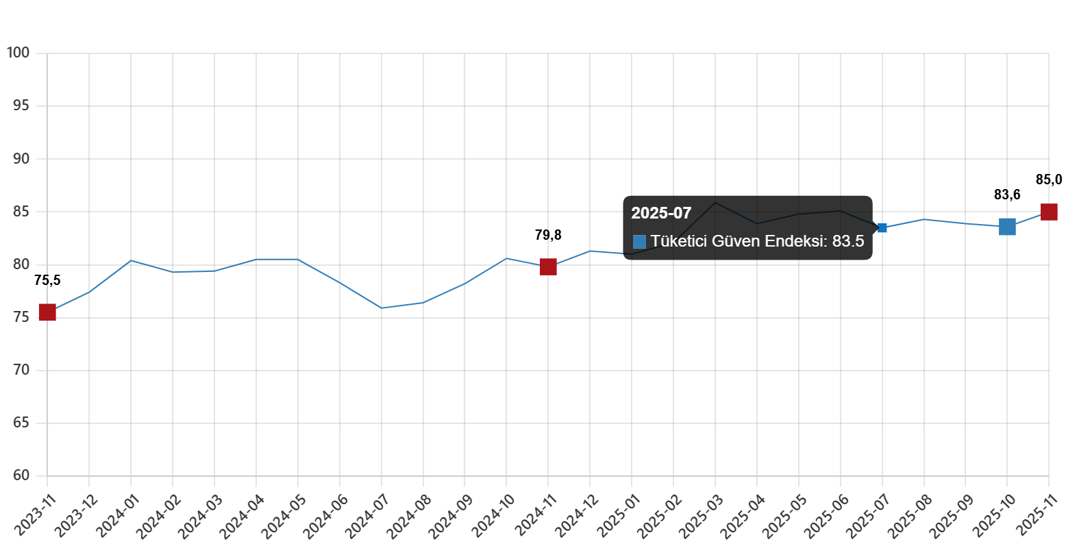Türkiye İstatistik Kurumu ve Türkiye Cumhuriyet Merkez Bankası işbirliği ile yürütülen tüketici eğilim anketi sonuçlarından hesaplanan tüketici güven endeksi, Ekim ayında 83,6 iken Kasım ayında %1,6 oranında artarak 85,0 oldu.