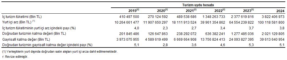 Ülkemizde doğrudan turizm amaçlı gayrisafi katma değer 2024 yılında 2 trilyon 21 milyar 129 milyon 805 bin TL olarak gerçekleşti. Doğrudan turizm amaçlı gayrisafi katma değerin toplam gayrisafi katma değer içerisindeki payı %5,1 oldu.