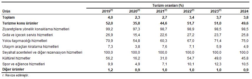 Turizm faaliyetleri ile ilgili olan ürünler için turizm oranları, 2019-2024
