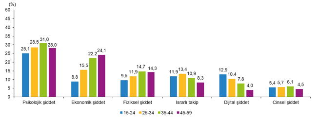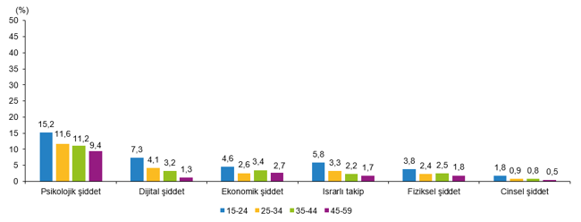 Tüm şiddet türleri yaş grubuna göre incelendiğinde, son 12 ayda en yüksek oranda şiddete 15-24 yaş grubundaki kadınlar maruz kaldı. Son 12 ayda psikolojik şiddet %15,2 ile en çok 15-24 yaş grubundaki kadınlarda; en az %9,4 ile 45-59 yaş grubundaki kadınlarda görüldü.