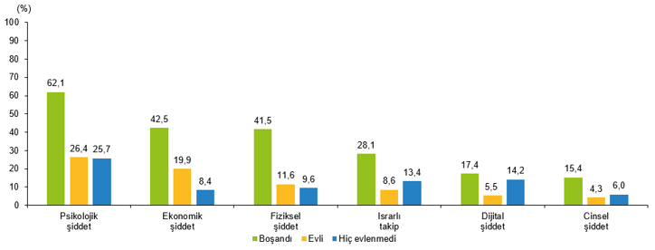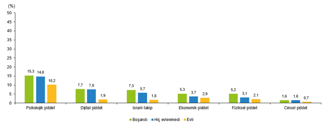 Yaşamının herhangi bir döneminde maruz kalınan şiddet değerlendirildiğinde, boşanan kadınların %62,1’i psikolojik, %42,5’i ekonomik, %41,5’i ise fiziksel şiddete maruz kalırken; evli kadınların %26,4’ü psikolojik, %19,9’u ekonomik, %11,6’sı ise fiziksel şiddete maruz kaldı. Hiç evlenmeyen kadınların %25,7’si psikolojik şiddete, %14,2’si dijital şiddete, %13,4’ü ise ısrarlı takibe maruz kaldı.