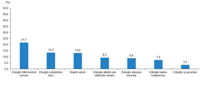 Eşi veya birlikte olduğu kişinin fiziksel ve/veya cinsel şiddetine maruz kalan kadınların belirttiği şiddet nedenleri incelendiğinde, erkeğin öfke kontrolü %21,7 ile ilk sırada yer alırken, erkeğin yetiştirilme tarzı %13,3 ile ikinci, maddi sıkıntı ise %13,0 ile üçüncü sırada yer aldı.