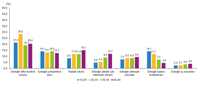 Eşi veya birlikte olduğu kişinin fiziksel ve/veya cinsel şiddetine maruz kalmış kadınların uğradığı şiddet davranışının nedeni olarak erkeğin öfke kontrol sorunu olduğunu belirtenlerin %28,3’ünün 25-34 yaş grubundaki kadınlar olduğu görüldü. Şiddet davranışının nedeni olarak maddi sıkıntıyı belirtenlerin %15,1’inin 45-59 yaş grubundaki kadınlar; erkeğin kadını kıskanmasını belirtenlerin %14,1’inin 15-24 yaş grubundaki kadınlar olduğu görüldü.