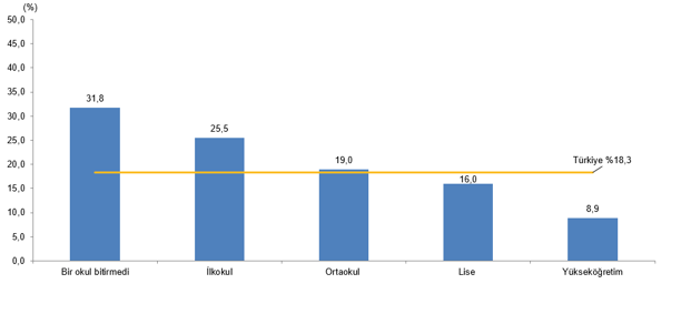 Yaşamının herhangi bir döneminde ekonomik şiddete maruz kalan kadınlar tamamlanan eğitim durumuna göre incelendiğinde, bir okul bitirmeyen kadınlar %31,8 ile ilk sırada yer alırken, yükseköğretimi tamamlayan kadınlar ise %8,9 ile son sırada yer aldı.