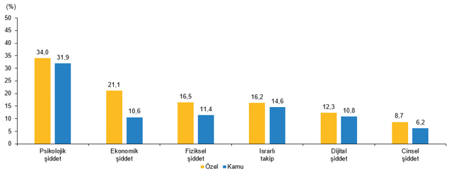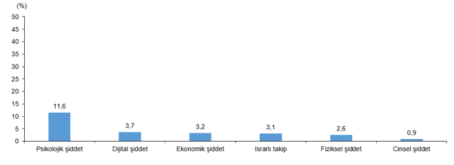 Son 12 ayda kadınların %11,6’sı psikolojik şiddete, %3,7’si dijital şiddete, %3,2’si ekonomik şiddete, %3,1’i ısrarlı takibe, %2,6’sı fiziksel şiddete, %0,9’u cinsel şiddete maruz kaldı. Şiddet türleri arasında birinci sırayı psikolojik şiddet alırken ikinci sırayı dijital şiddet aldı.