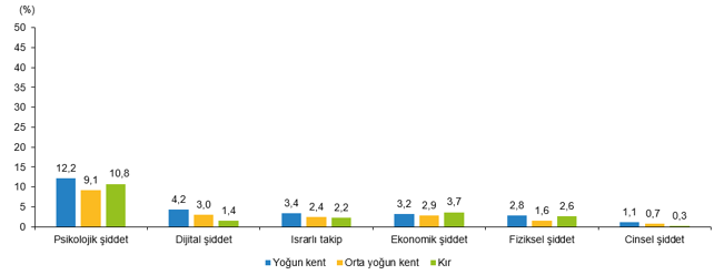 Son 12 ayda şiddete maruz kalan kadınlar şiddet türüne göre incelendiğinde, yoğun kentte yaşayan kadınların %12,2’si psikolojik, %4,2’si dijital şiddete, %3,4’ü ısrarlı takibe maruz kalırken; orta yoğun kentte yaşayan kadınların %9,1’i psikolojik, %3,0’ı dijital, %2,9’u ekonomik şiddete; kırda yaşayan kadınların ise %10,8’i psikolojik, %3,7’si ekonomik, %2,6’sı fiziksel şiddete maruz kaldı.