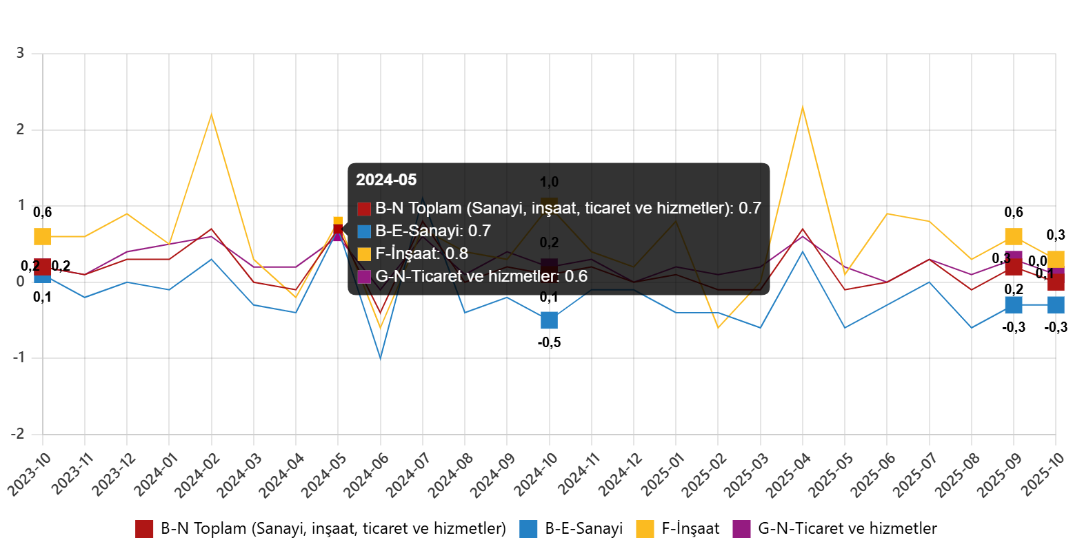 Ücretli çalışanların alt detaylarına bakıldığında; 2025 Ekim ayında ücretli çalışanlar aylık olarak sanayi sektöründe %0,3 azaldı, inşaat sektöründe %0,3 arttı ve ticaret-hizmet sektöründe %0,1 arttı.