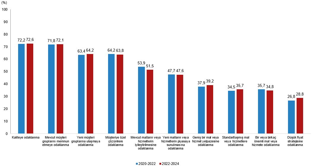 2022-2024 döneminde yenilik faaliyetinde bulunan girişimlerin ekonomik performansını etkileyen stratejiler önem derecesi açısından incelendi. Girişimlerin %72,6’sı kaliteye, %72,1’i mevcut müşteri gruplarını memnun etmeye ve %64,2’si yeni müşteri gruplarına ulaşma stratejilerine çok önem verdi.