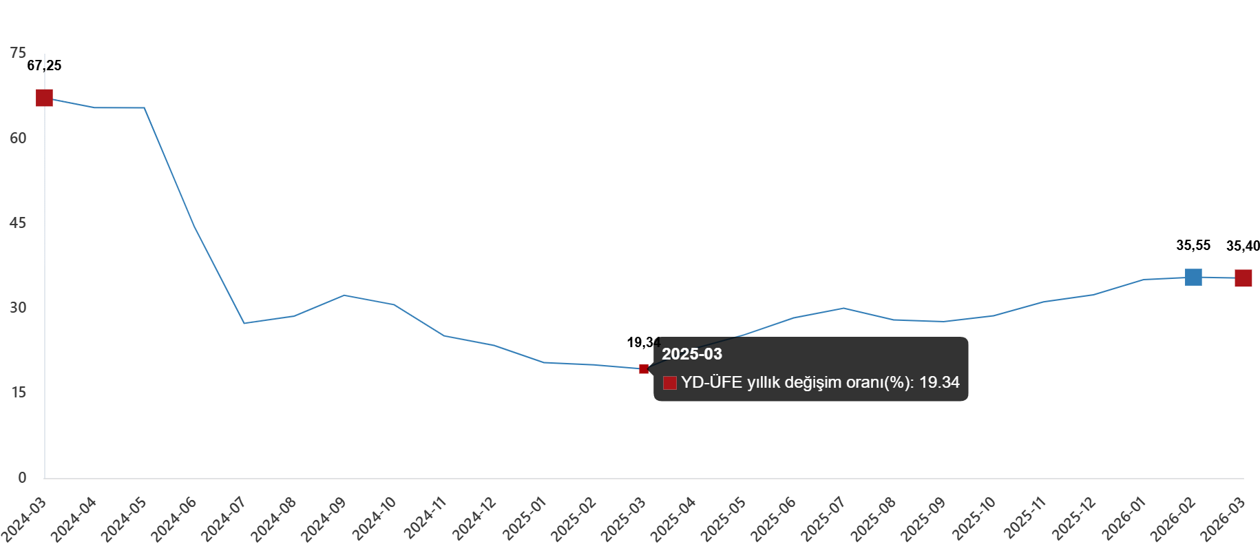 YD-ÜFE 2026 yılı Mart ayında bir önceki aya göre %3,94 artış, bir önceki yılın Aralık ayına göre %10,73 artış, bir önceki yılın aynı ayına göre %35,40 artış ve on iki aylık ortalamalara göre %30,23 artış gösterdi.
