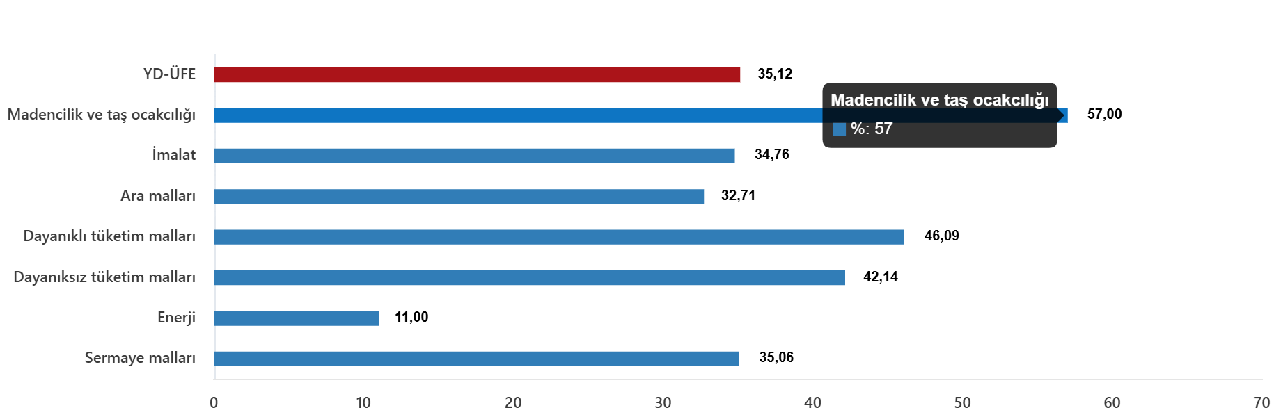 Ana sanayi gruplarının yıllık değişimleri; ara mallarında %32,71 artış, dayanıklı tüketim mallarında %46,09 artış, dayanıksız tüketim mallarında %42,14 artış, enerjide %11,00 artış, sermaye mallarında %35,06 artış olarak gerçekleşti.